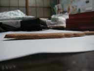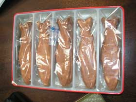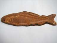 鮎煎餅 体長13.5センチ、厚さ4ミリ。瓦煎餅みたいな感じでおいしいです。ばら売りはない。側線まで入っていてなかなかリアルです。 |