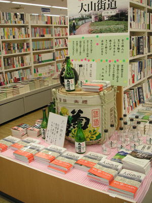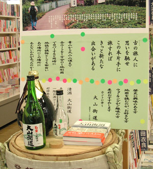 | こちらは、文教堂伊勢原とうきゅう店さんでの展示です。2007年8月6日の更新記録にも書きましたが、本の発売に合わせて、「大山街道」というお酒の酒瓶やお酒の樽を酒造会社から借りて、ディスプレーしてくださり、広い店内でもひときわ目立っていました。パネルも作っていただきました(写真は伊勢原市下糟屋の咳止地蔵付近)。