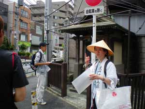 延命地蔵の前で説明する平井さん。ここで慈眼寺ルートと行善寺ルートに分かれます。