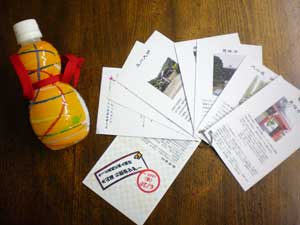 10時にハロー*ようがに集合、参加費500円を払い、参加者で記念撮影後、ハロー*ようがを出発。 ウォークの参加者には見学する寺社や道標などのポイントを印刷したカードと、「ひょうたんから水」を旅の友として支給されます。 |