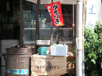 この氷屋さんの建物は関東大震災後に建てられ約80年前ぐらいのもので、氷屋さん自体は4〜50年続けていられるそうです。よく見ると、隣の建物もレトロっぽいです。氷屋さんではやきいもも売っています。↓