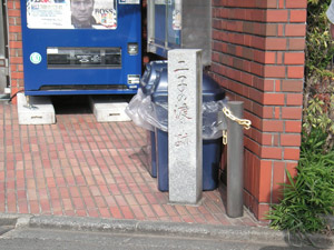 多摩川沿いにある二子の渡しの碑。福祉作業所の前にあります。下の写真にあるゴミ箱を撮影のために移動し、終わるとまた戻していました。さすがです。