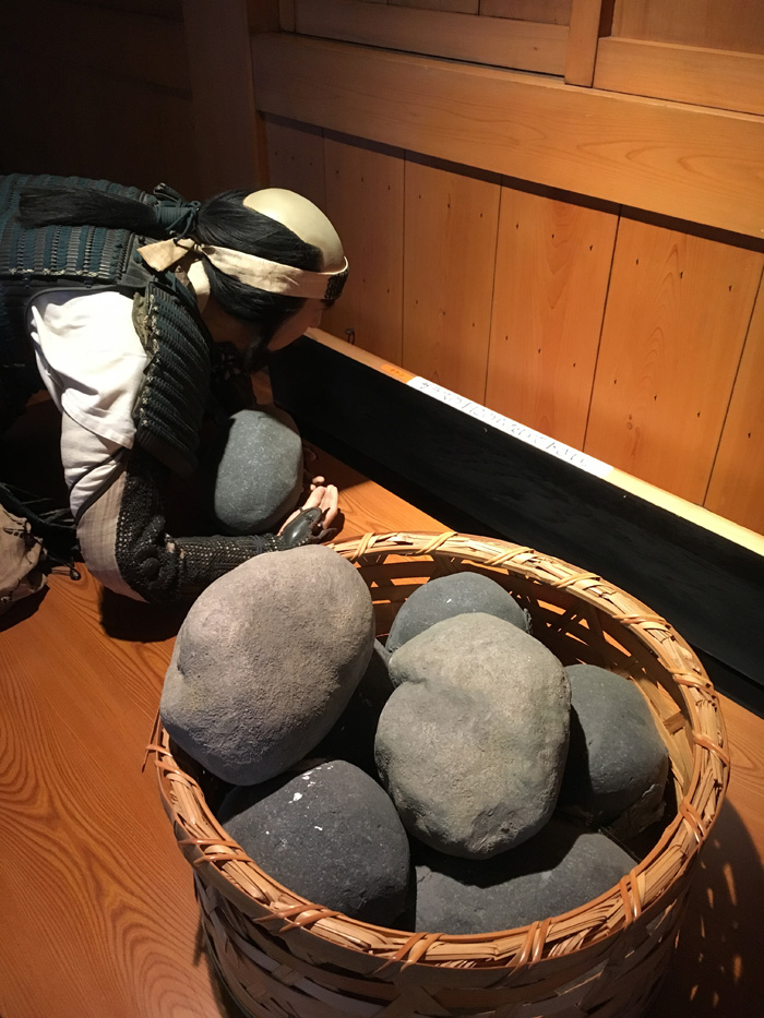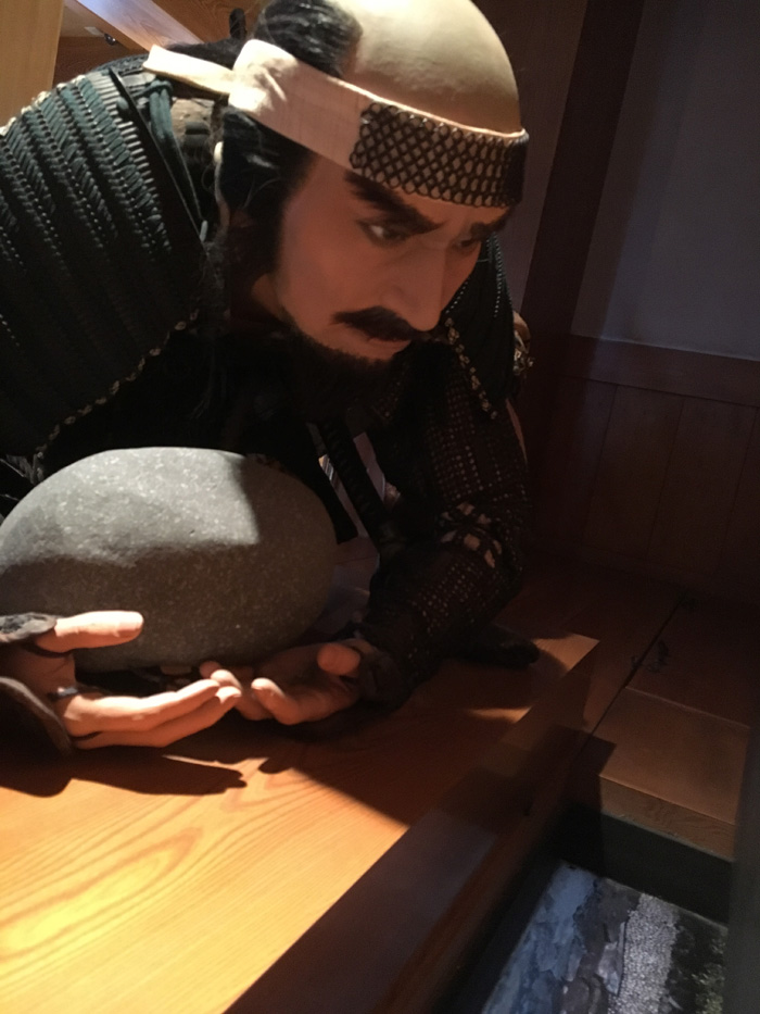 今の清洲城は資料館になっています。天守の防衛を担う兵士が再現されています。石を落とそうと隙間から下の様子をうかがっています。実際に下が見えました。
