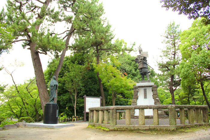 清洲公園の信長と妻濃姫の像。濃姫が囲いの外にいるのは、元は別の場所(清洲城広場)にあった像だから。夫婦はともにあるべきの意見が寄せられ、移されたそうです。