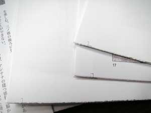| 機械ではなく手で折って切っているので、切り口がごつごつしている。この段階では、実際の仕上がり寸法よりも大きいです。 |