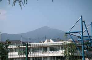 | 水無川沿いの道を秦野市役所に向かって歩いていくと、右手に雄大な大山の姿が見えます。何度か通っていますが、大山と気がついたのはこの日でした。こちら側からだとこんな見え方なのですね。全面の建物は本町幼稚園です。(2008年7月24日) |