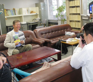 | 当日、3名の記者の前で(本当は6名なのですが、夏休み中とのこと)、ご自身のこと、出版の経緯、本の内容の説明をされました。行く前は「子ども相手とは違いますから」とおっしゃっていましたが、落ち着いた岡澤さんの話しぶりを、記者の方も熱心に聞かれていて、さすがと感心いたしました。 |